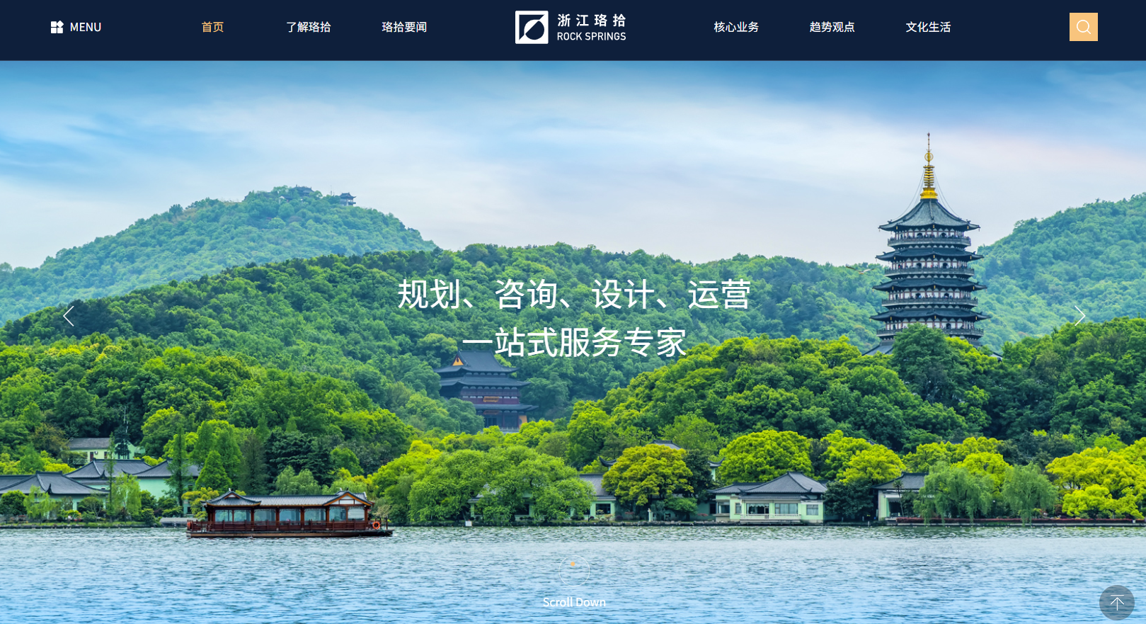 当用户第一次打开网站,画面被完整留给一张西湖实景图——青山、湖水与雷峰塔交织成的宁静画面。