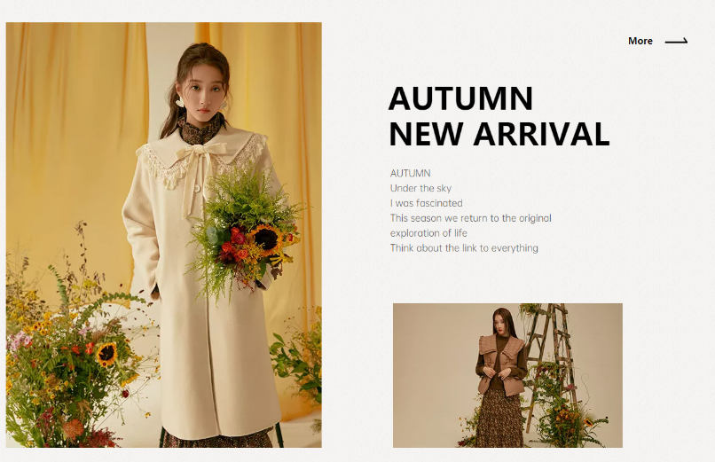 每一季上线前提前拍摄主视觉图,主页标题呼应季节情绪(如“Autumn New Arrival”、“Into the Bloom”)。