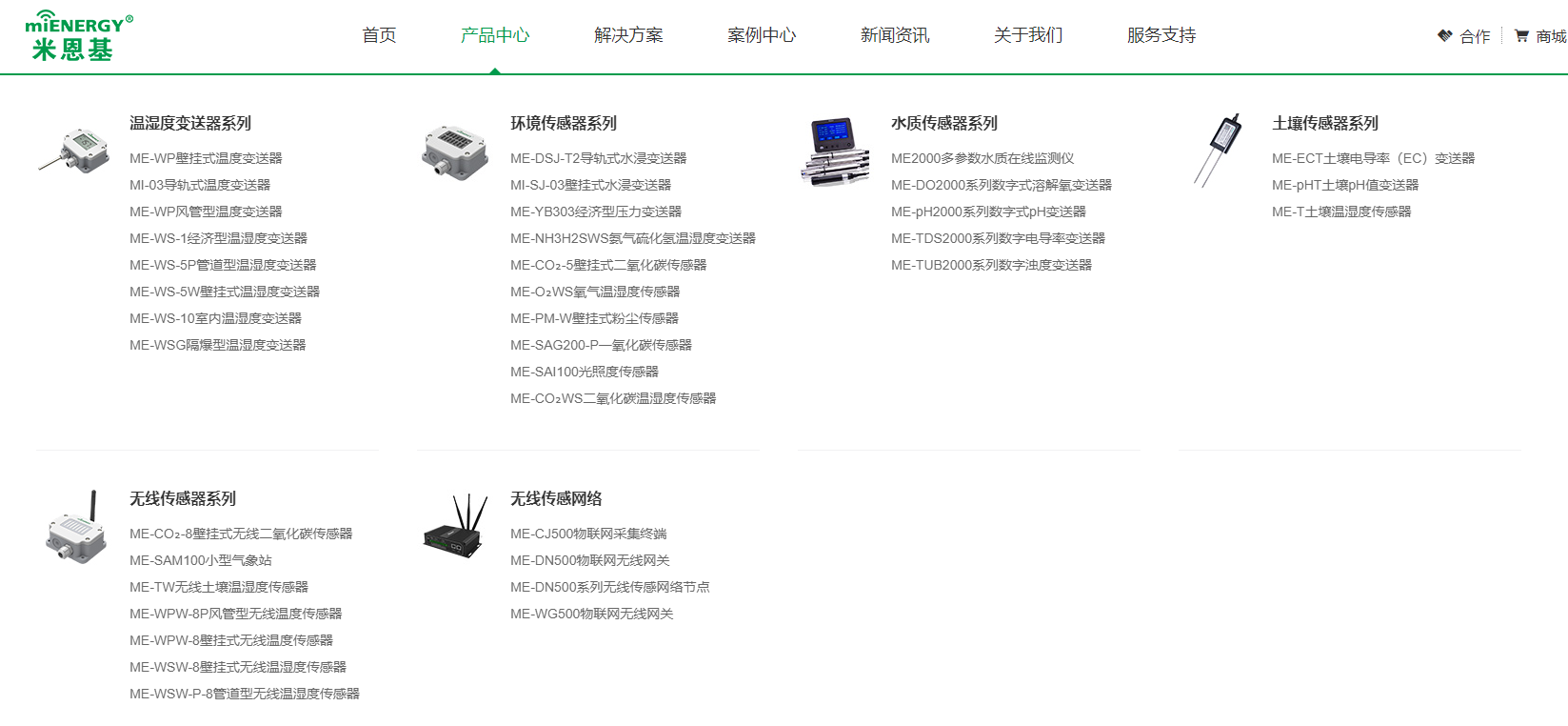 分组清晰,如“温湿度变送器系列”“环境传感器系列”“水质传感器系列”等;